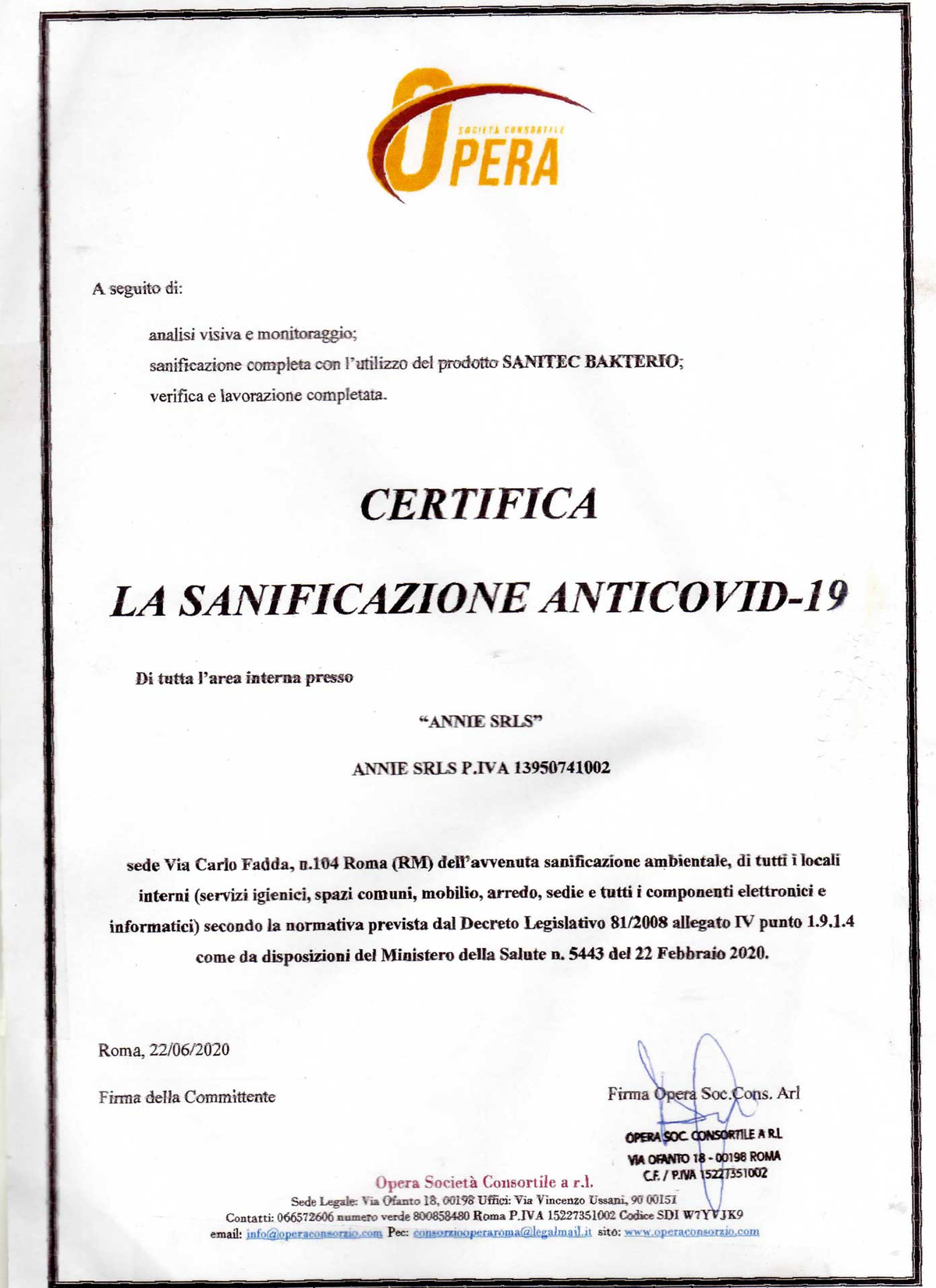 - sanificazione mediante ditta specializzata “Opera Società Consortile a. r. l.” con l’utilizzo del prodotto SANITEC BAKTERIO effettuata prima della riapertura della struttura e certificata come riportato qui accanto